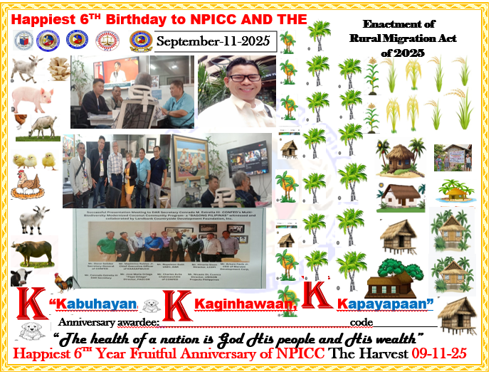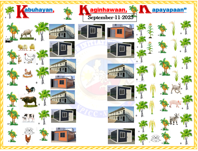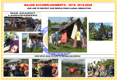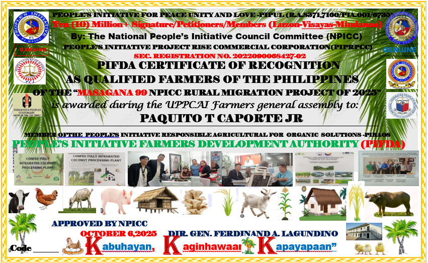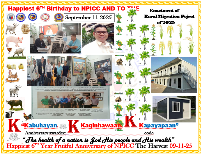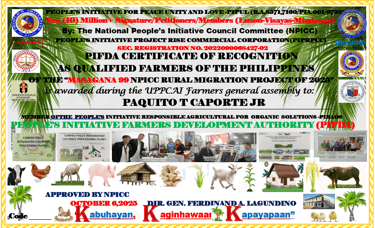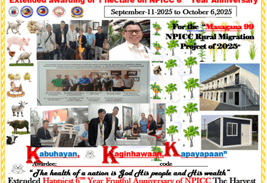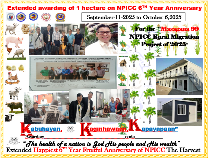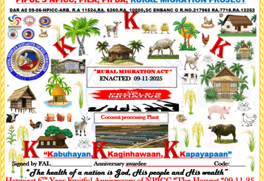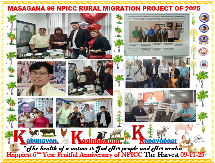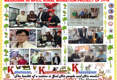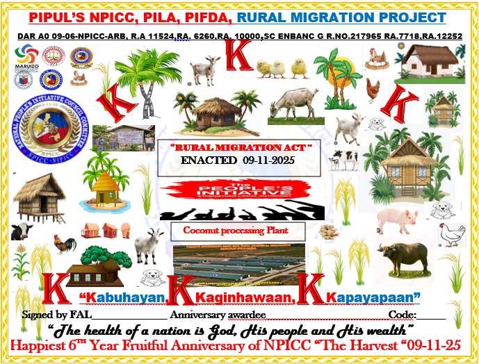 The mission must be completed of a sustainable and stable life development of every family, individual, tribes, implementation of systematic housing projects and business establishments that mainly benefits the people, major and basic services must be full free granted and rendered for all FILIPINO and day to day life essential sustainability supported by the "MASAGANA 99 NPICC RURAL MIGRATION PROJECT 2025" through a determined transition of new governance and laws.