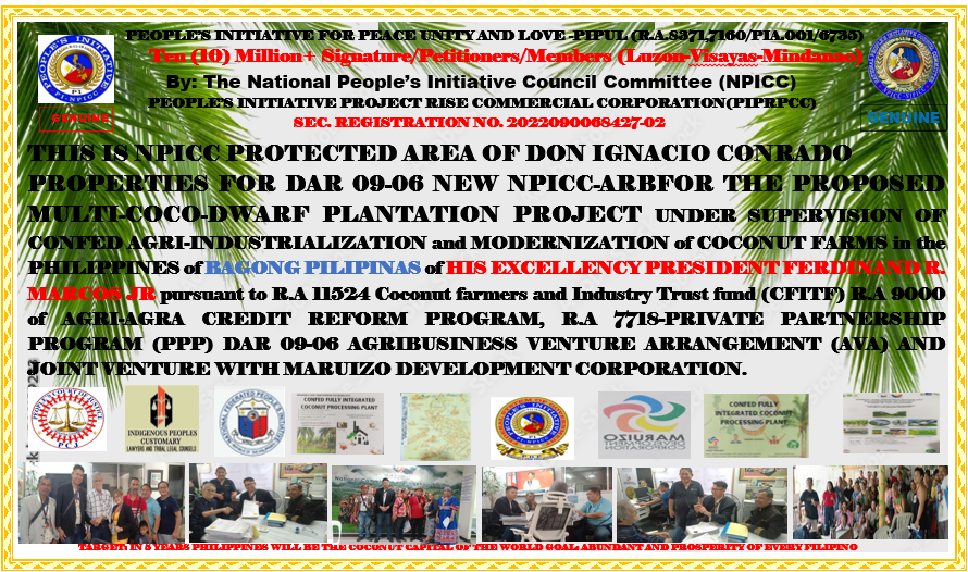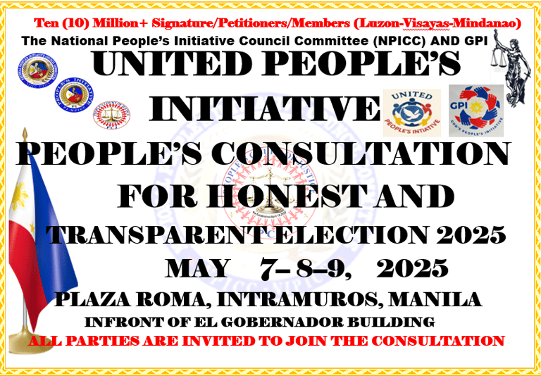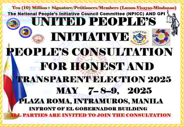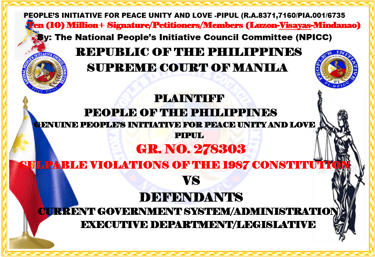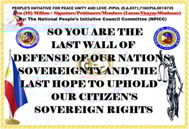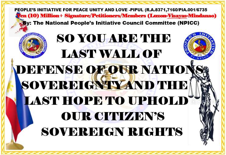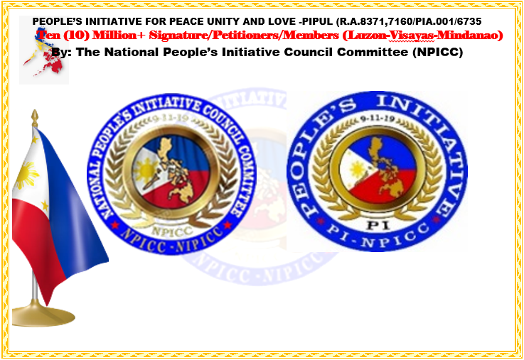The NPICC under the guidelines of the 1987 CONSTITUTION Article 6 section 1&32 r.a.6735 Comelec Resolution No.2300.R.A 7160 heading up the 10 Million plus Filipinos to Address the transition of government system to a better Constitution.