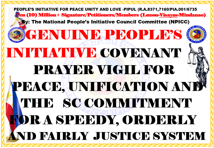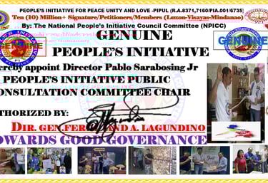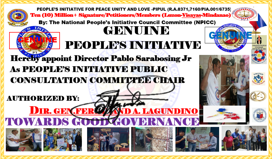 ANG GENUINE PEOPLE’S INITIATIVE-FOR PEACE UNITY AND LOVE O ACTION NG BAYAN AY WALANG AGENDA NA KALABANIN ANG SINUMAN KUNDI ANG PAGTUTULUNGANG ISAAYOS ANG SISTEMA NG PAG GOBYERNO UPANG HIGIT NA MAIPARATING ANG MGA AGARANG SERBISYO AT MARAMDAMAN NG BAWAT MAMAMAYAN ANG PAGUNLAD NG ATING MGA LIPUNAN, ANG HAKBANG NA ITO AY PINAKAMAINAM NA PARAAN NA NAAYON SA ATING SALIGANG BATAS UPANG EPEKTIBO ITONG PARTISIPASYON NG PAGTULONG NG BAWAT MAMAMAYAN. MAHALAGA NA MAKIBAHAGI ANG BAWAT KINAUUKULAN SA ATING PAMAYANAN AT MAKAGAWA NG MGA LEGAL AT EPEKTIBONG PARAAN NG PAGBABAGO. ANG MAMAMAYAN ANG MEARI NG GOBYERNO KARAPATAN DIN NILA NA AYUSIN ANG ALINMANG IKABUBUTI NG TAKBO NG KANILANG PAGAARI, WALANG PAGHIMUK NG PAGBABA NG SINUMANG NAKAUPO SA MGA POSISYON NG PAG GOBYERNO KUNDI TULUNGAN SILANG IAHON SA KAHIRAPAN ANG BAWAT PAMAYANAN SA PAMAMAGITAN NG PARTISIPASYON NG BAWAT MAMAMAYAN. BILANG NAMUMUNO SA KOMITENG ITO HINIHIMOK KO NA MAKIBAHAGI ANG LAHAT SA MABUTING ADHIKAING ITO UPANG HINDI TAYO PAGIWANAN NG IBAYONG BANSA KUNG SAAN DATI TAYONG MASMAUNLAD SA KANILA MARAMI PONG SALAMAT
